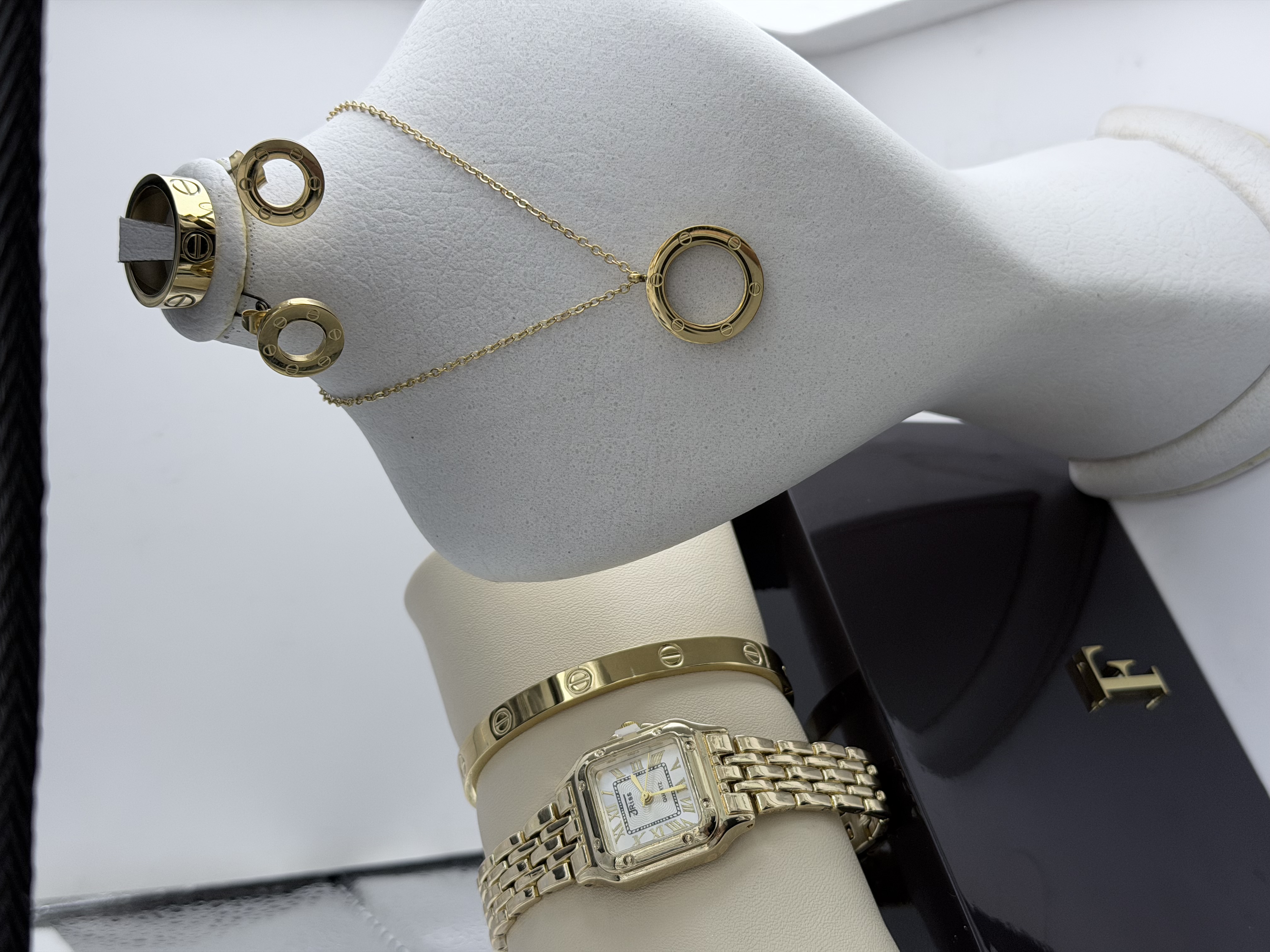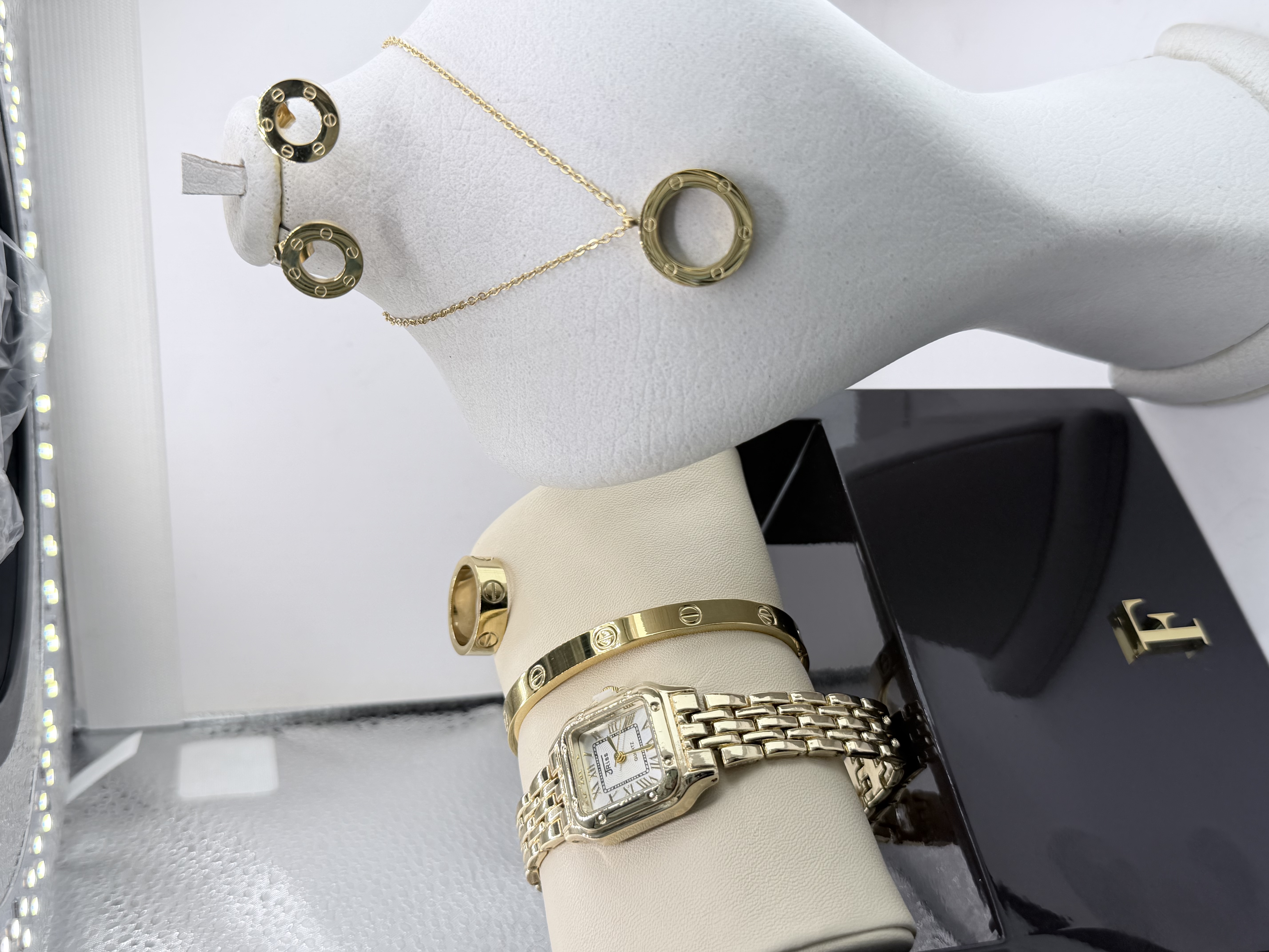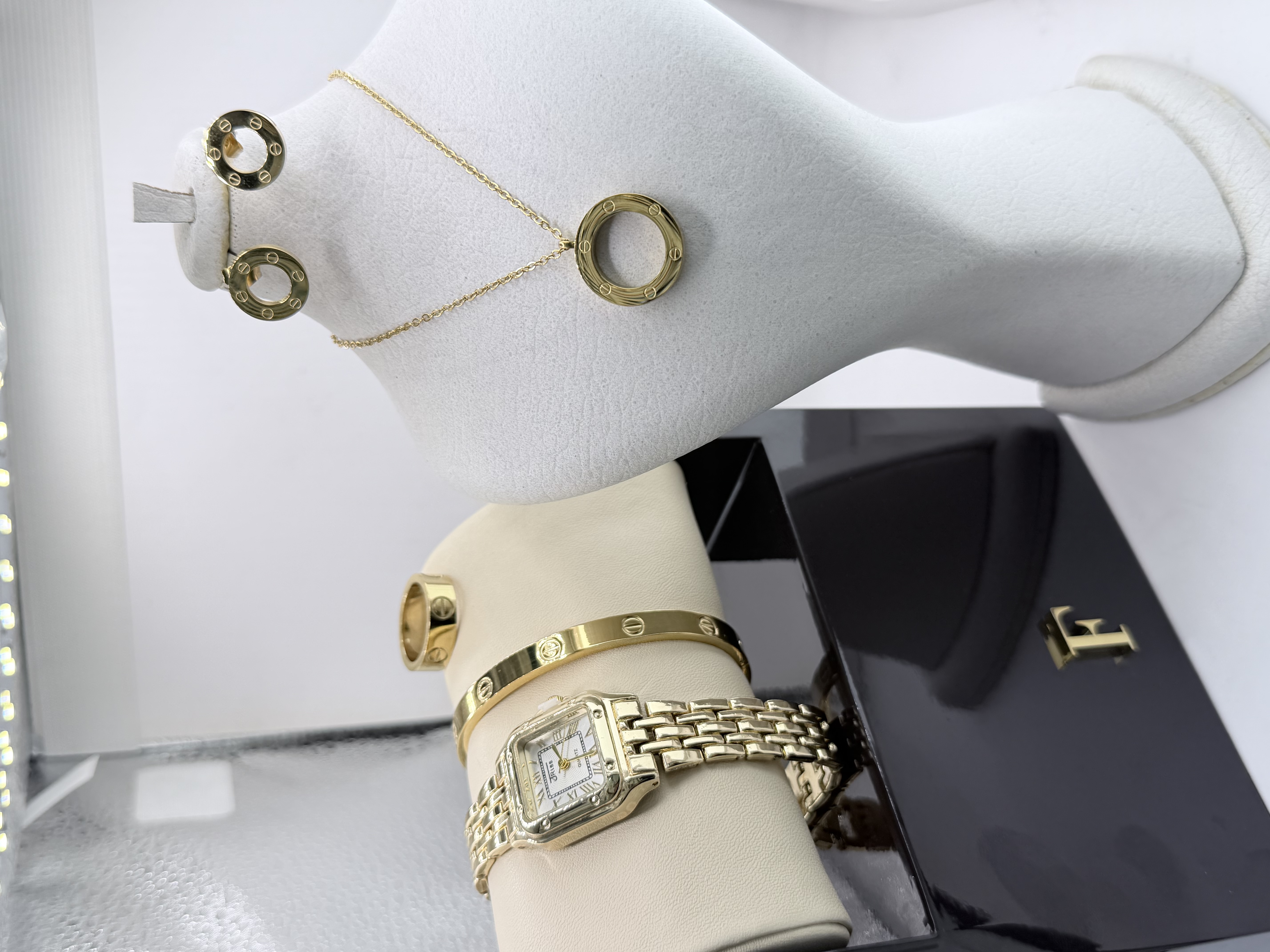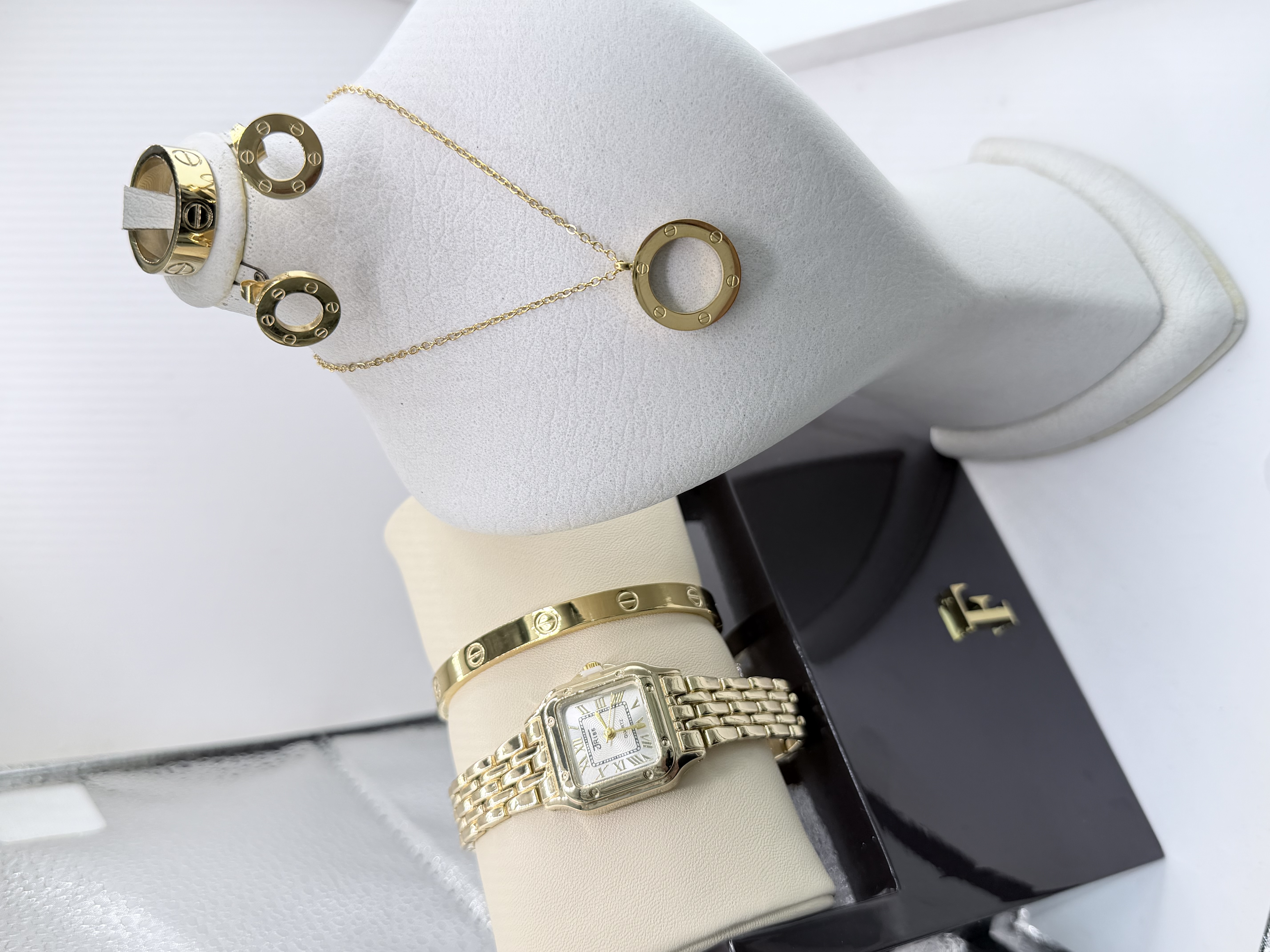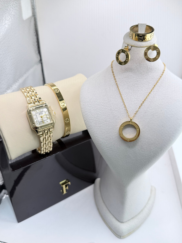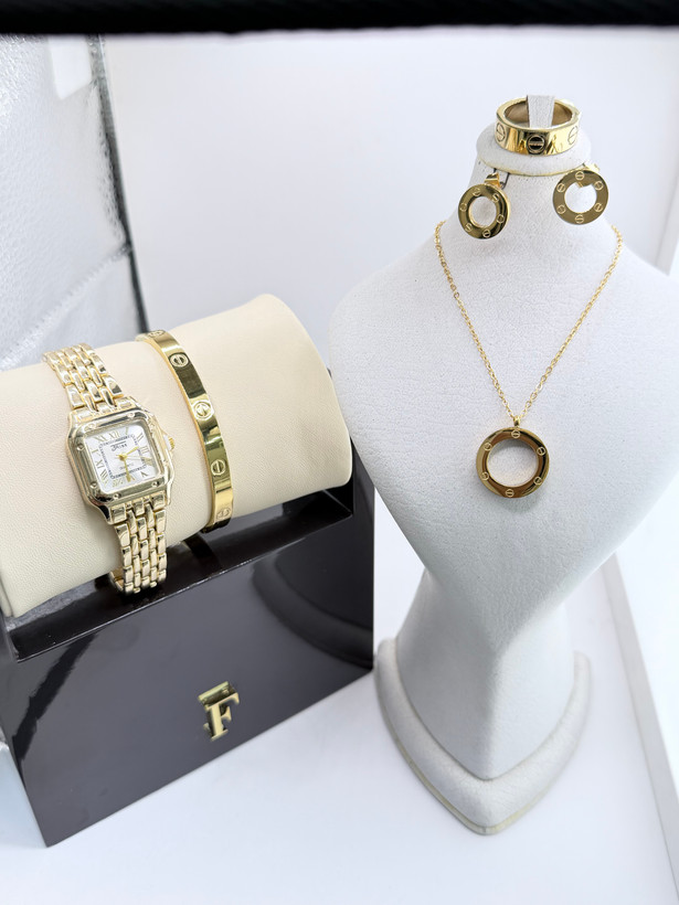 به همراه ست کامل گردنبند و دستبند و گوشواره و حلقه طرح کارتیه لاو