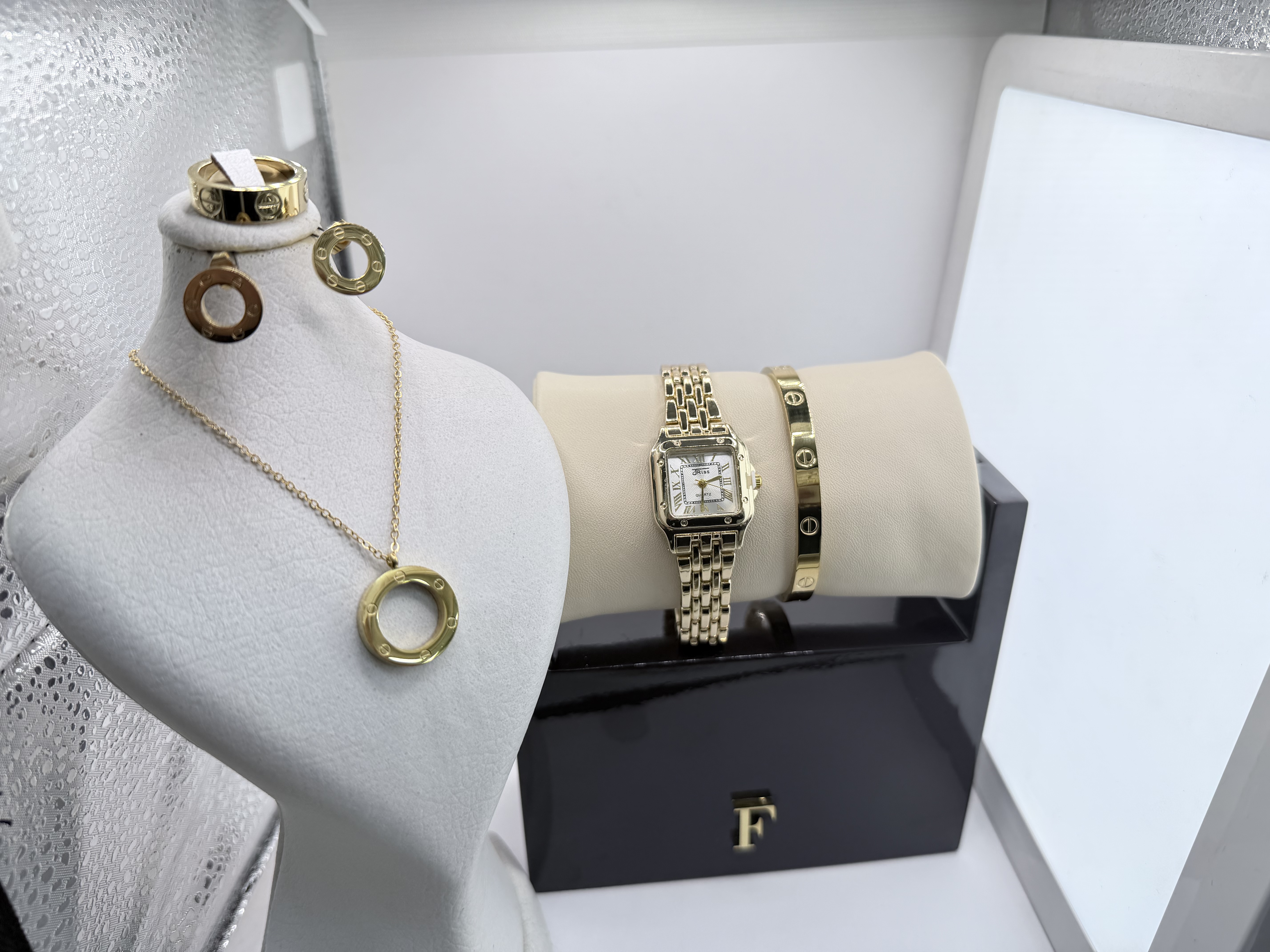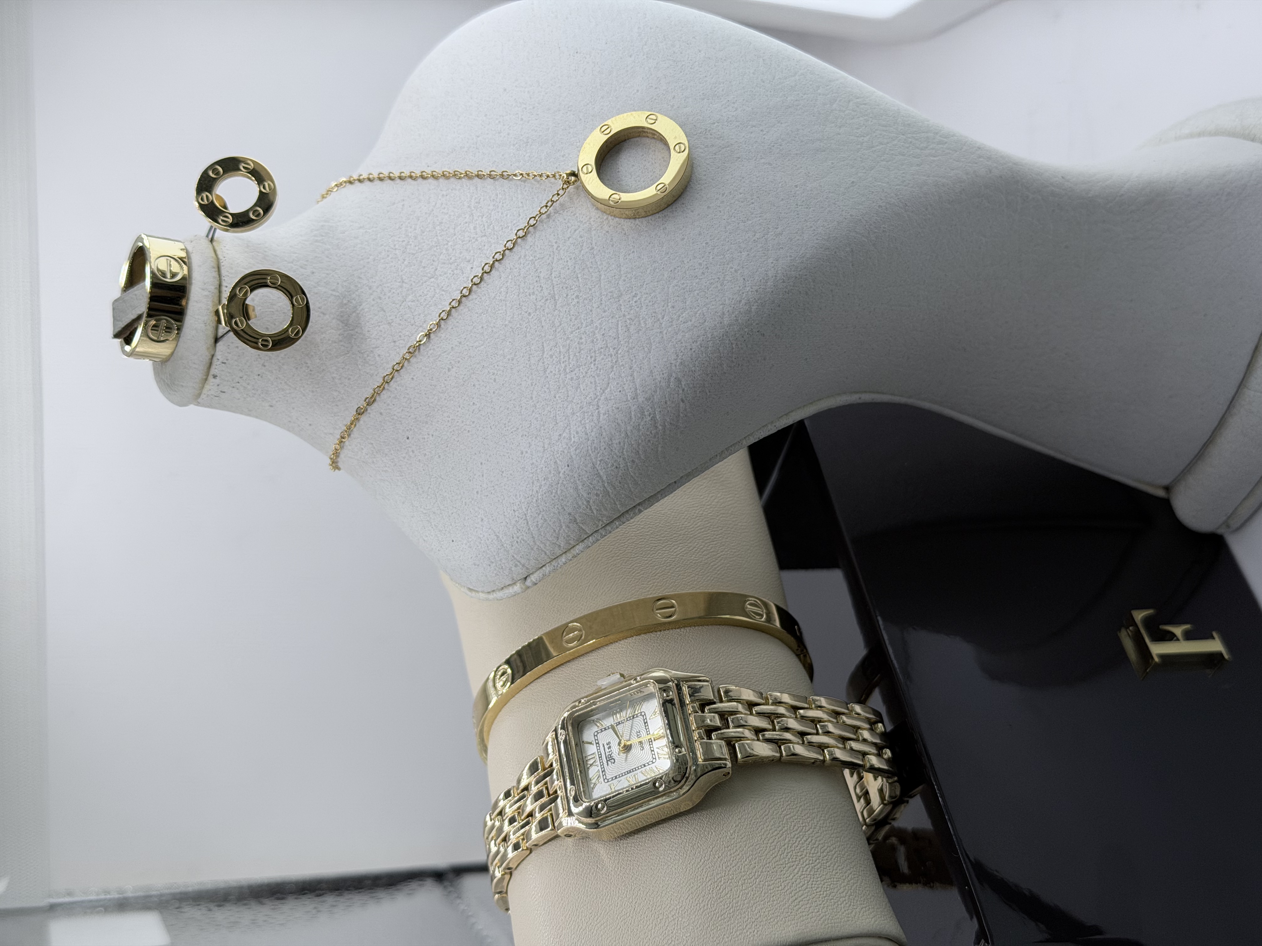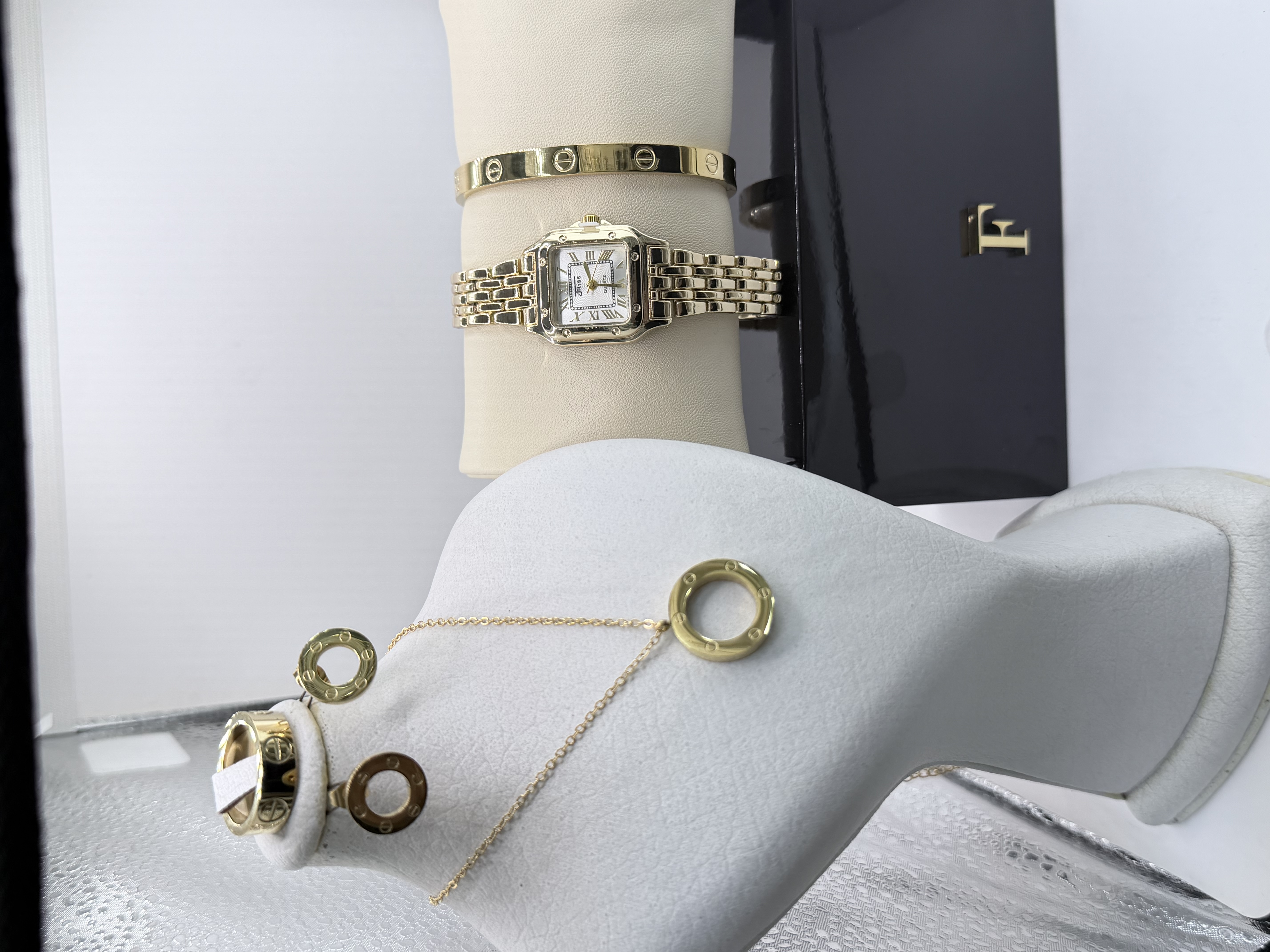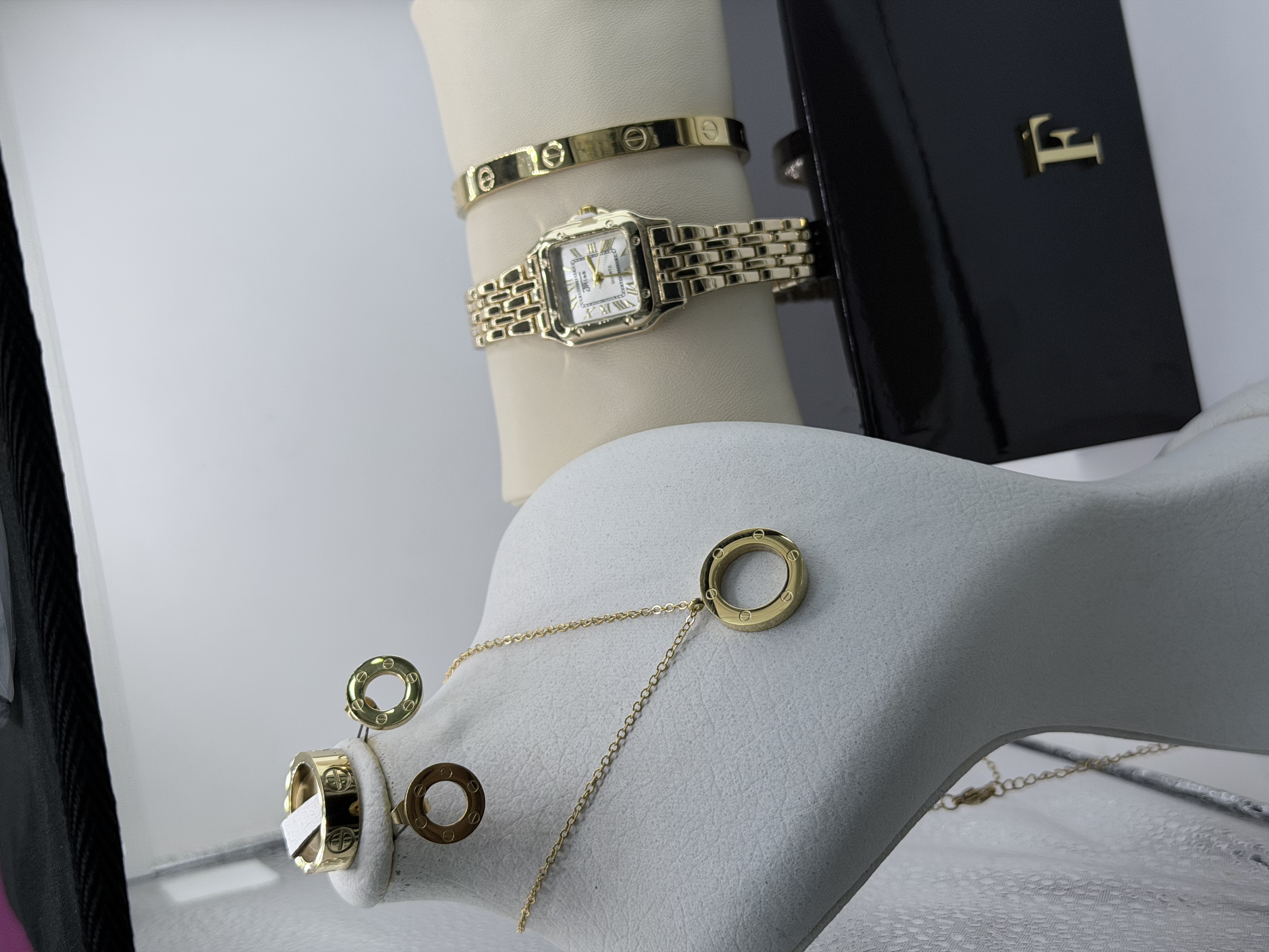 به همراه ست کامل گردنبند و دستبند و گوشواره و حلقه طرح کارتیه لاو