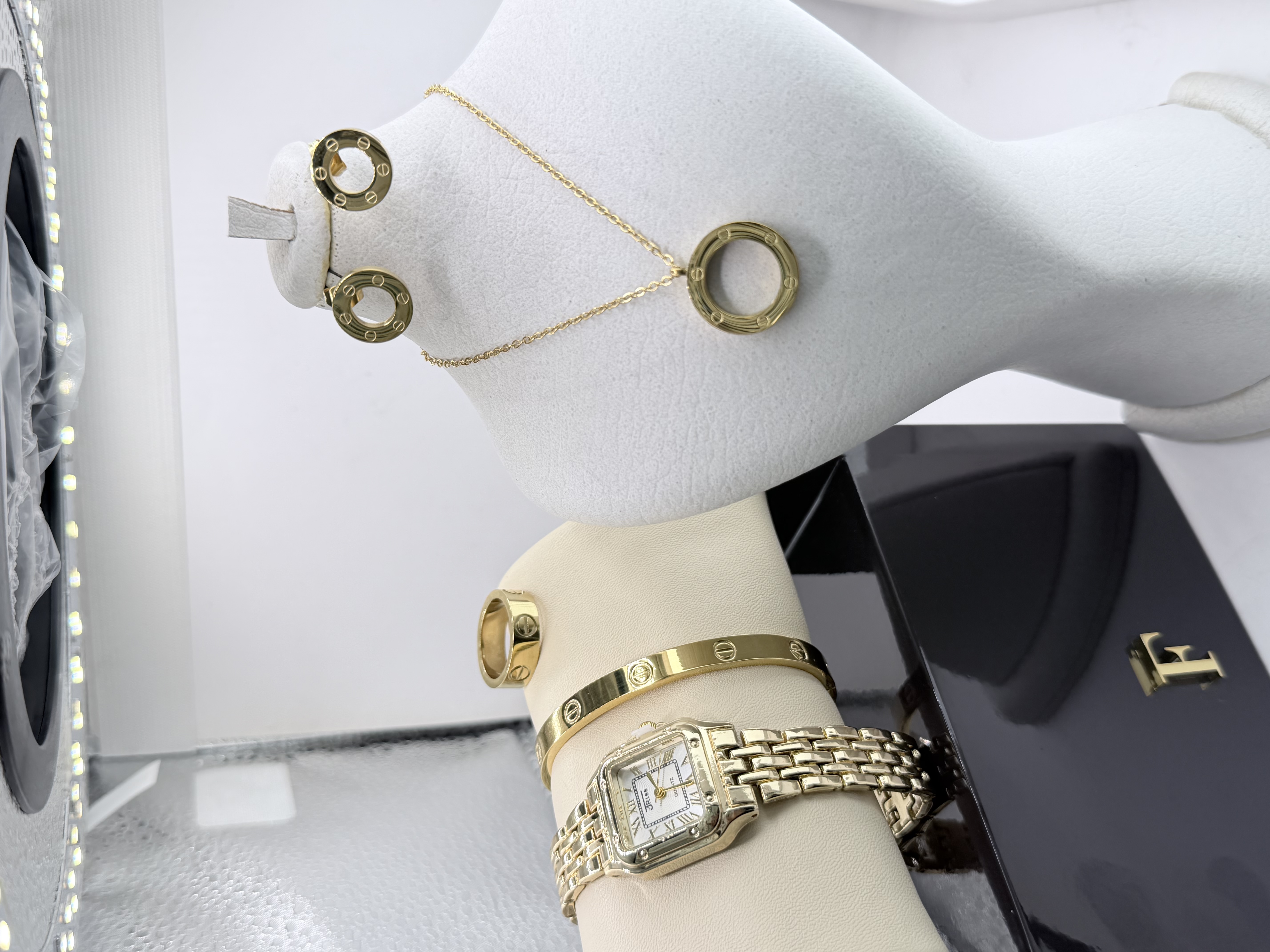 ناموجودست کامل ساعت زنانه طرح کارتیر به همراه گردنبند وگوشواره و حلقه و دسبند طرح کارتیه لاو